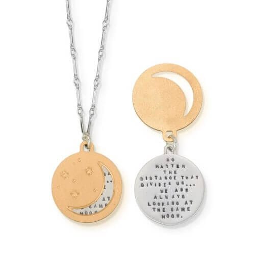 The Looking At The Same Moon necklace comes with a distinctly selected chain style. The pendants cannot be swapped or substituted for the chain from another necklace. These Kathy Bransfield necklaces are the great way to express yourself. They make the perfect gifts for mothers, sisters, daughters, aunts, cousins, friends, coworkers or just about anyone you have on your list. And perhaps most important of all, they make perfect gifts for yourself!!