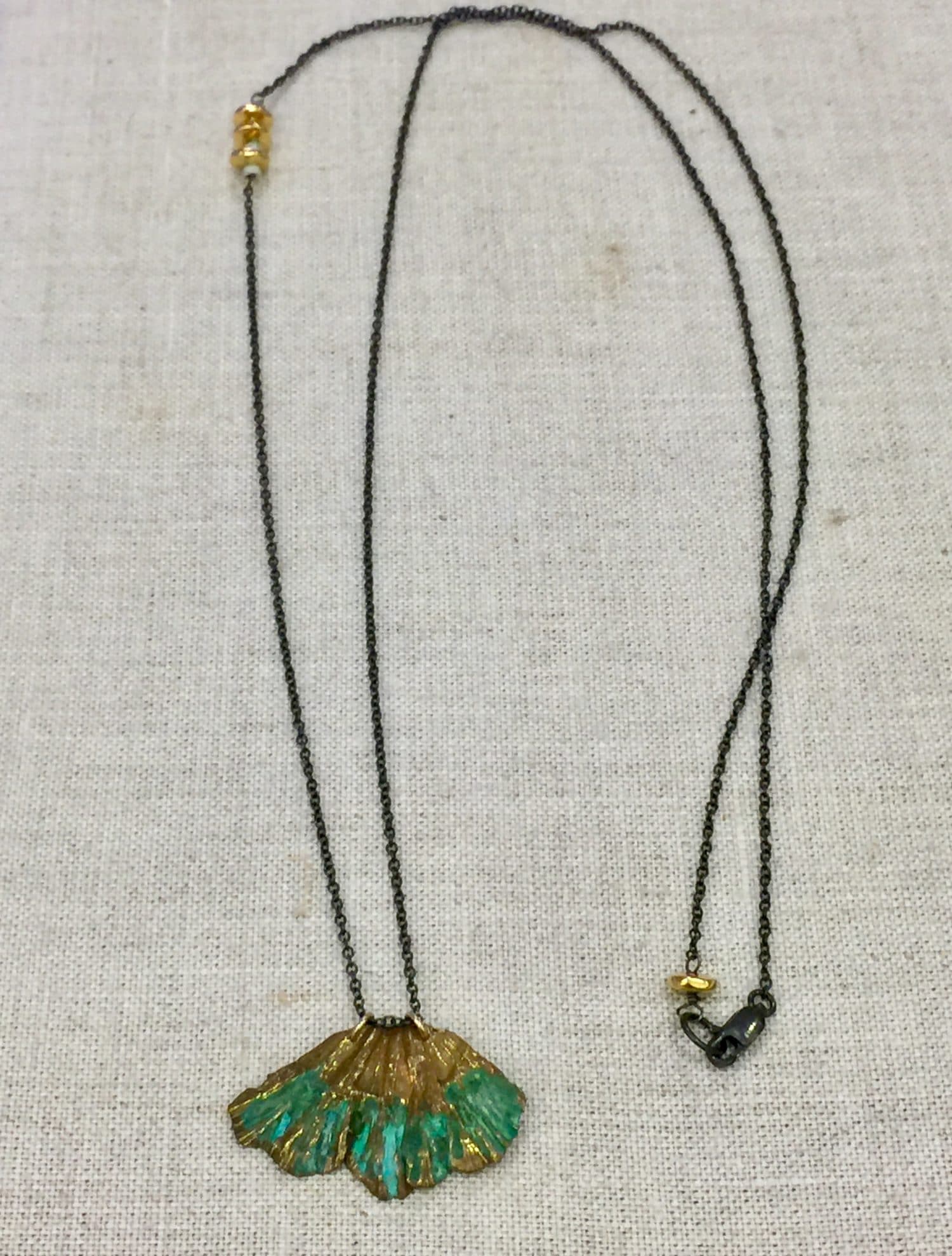 A mold made from lichen hangs upon an oxidized sterling silver necklace accented with gold plated beads.