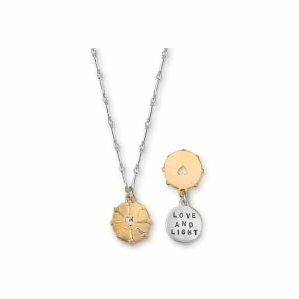 This Kathy Bransfield necklace is titled Love & Light. It is made of brushed sterling silver, 18k gold plated bronze, 18″ bar and link chain, 1/2″ pendant, TEXT: “Love & Light”
