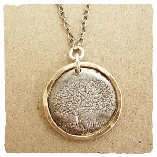 View ArtistThe Mighty Oak Necklace is encircled with hammered 14kt gold filled wire. The sterling chain is adjustable from 16″ to 18″ and has a lobster clasp. The pendant is approx. 1″ wide. It is a wonderfully organic design that is both timeless and accessible. Handmade by J and I Jewelry. GFX85N