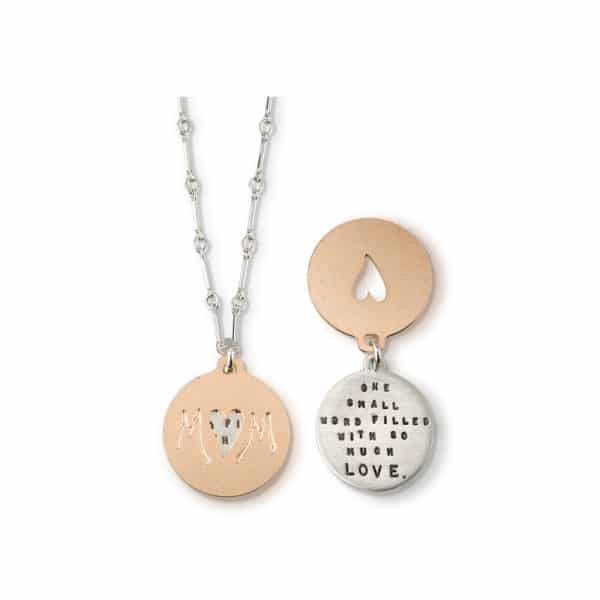 View ArtistThis Kathy Bransfield necklace is titled Mom. It is made of 18k Gold plated bronze and brushed silver, mom inscription with cut out heart, 18″ bar link chain, 3/4″ round pendant, TEXT: “One small word filled with so much love.”