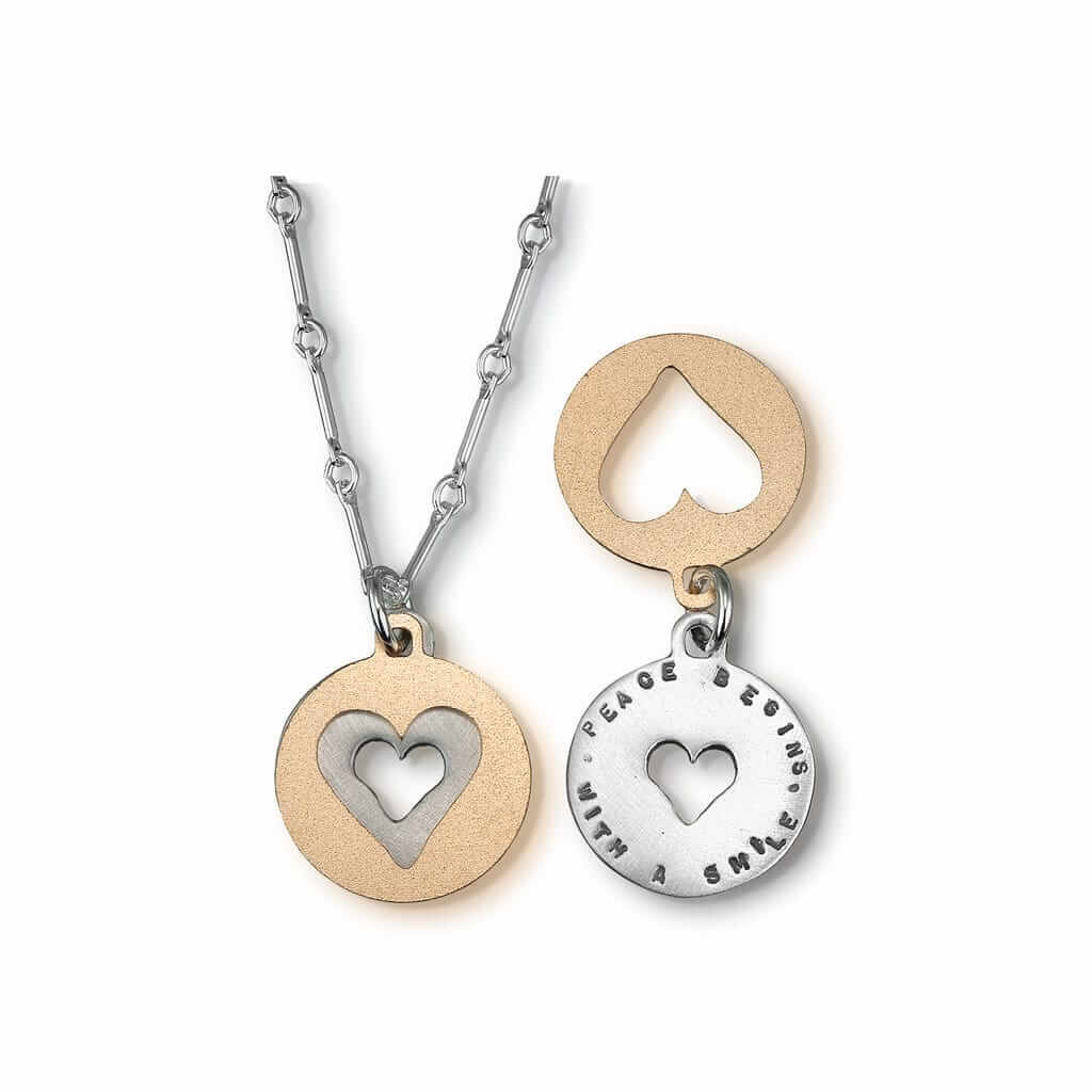 View ArtistThis Kathy Bransfield necklace is titled Mother Teresa Smile. It is made of 18kt Gold plated bronze and brushed Silver, 16″ Bar Link Chain, 5/8″ pendant, TEXT: “Peace begins with a Smile” -Mother Theresa