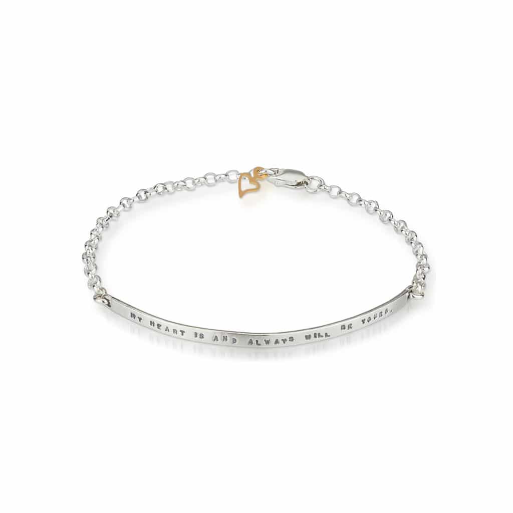 View ArtistThis Kathy Bransfield bracelet is titled My Heart. It is made of brushed sterling silver and 22k gold plated bronze, 7″ long, adjustable. A tiny heart charm adjoins the end of the chain. TEXT: “My heart is and always will be yours” – Jane Austen