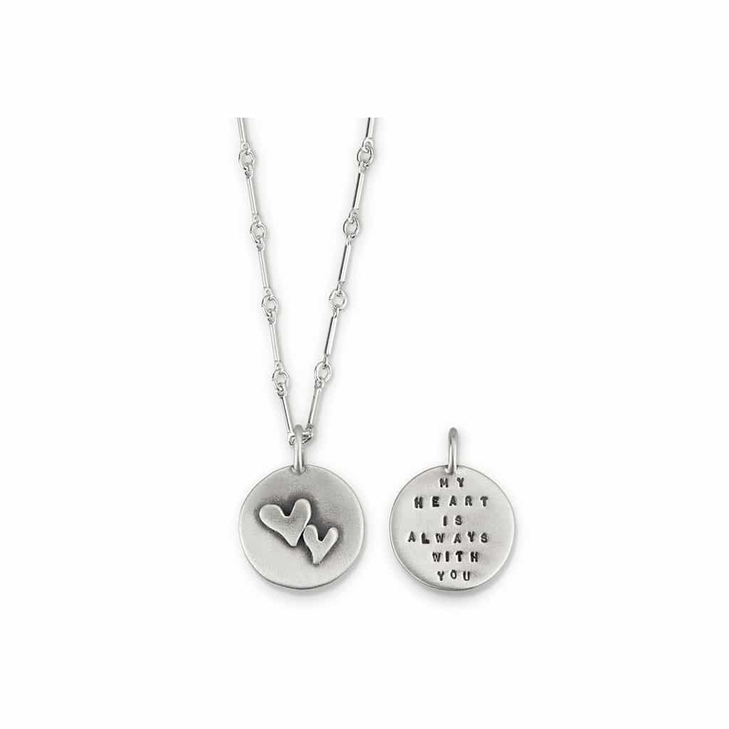 View ArtistThis Kathy Bransfield necklace is titled My Heart. It is made of Oxidized sterling silver, 18″ bar link chain, 5/8″ pendant, TEXT: “My heart is always with you.” This necklace is reversible – quote is on one side and hearts on the other.