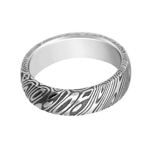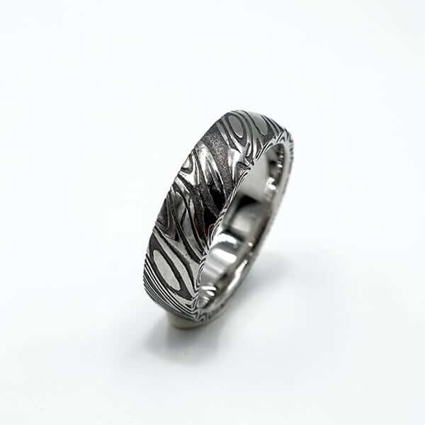 The Naked Damascus Wood Grain Ring is made of stainless steel. It is 6mm wide, has a wood grain pattern and a semi round profile. A darkening fee is applicable to all blackened pieces, and has already been applied to the price. Size 10 in stock. This ring can be resized by Chris Ploof for a fee. The Naked Damascus Wood Grain Ring is handmade by Chris Ploof.
