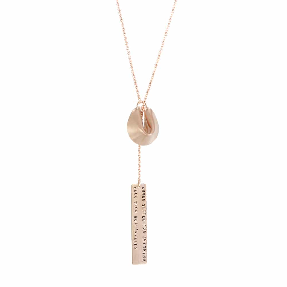 Never Settle Fortune Cookie Lariat. Keep your fortune message by your heart with this beautiful fortune cookie lariat.