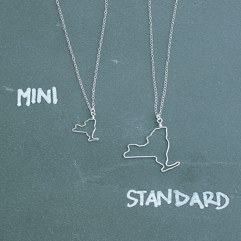 View ArtistThis delicate New York Outline Necklace is made from sterling silver wire and intricately hand formed into the outline of the state. No generic machine cut outs here! Each necklace comes on a 18″ sterling chain. Mini sizes are approximately 1/2″ to 3/4″ depending on the state. Standard sizes are approximately 1.5″ to 2″ wide.