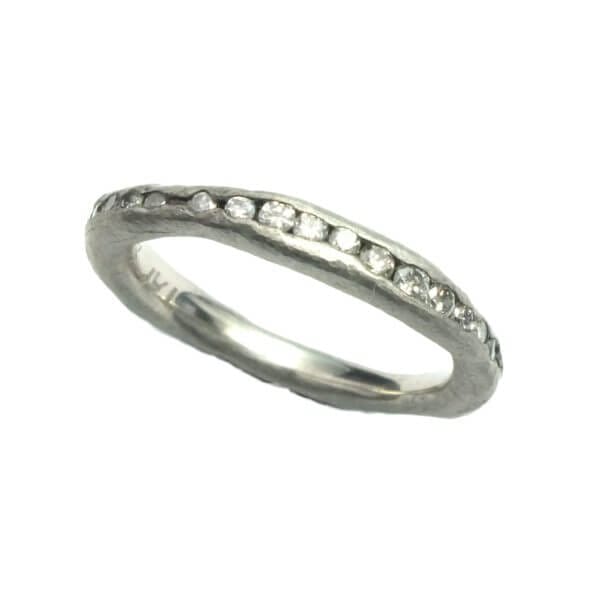 View ArtistThe Organic Diamond Platinum Band is handmade by Todd Pownell. It is 2 to 3mm wide Platinum irregular channel ring set with diamonds, lightly hammered sides and a darkened channel with approximately 0.40 to 0.50 carats of diamonds. It is available in either Platinum, Rose Gold and Yellow Gold. Organic Diamond Platinum Band. R227pt.