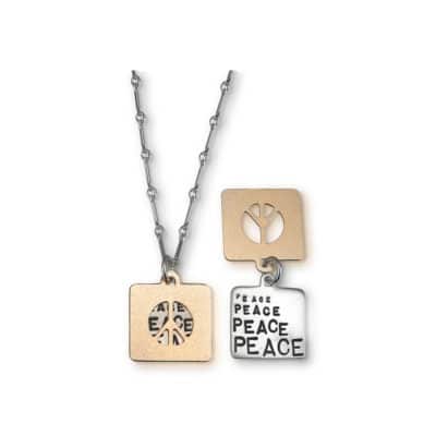 View ArtistThis Kathy Bransfield necklace is titled Peace. It is made of 18kt Gold plated bronze and brushed Silver, 18″ bar link chain, 5/8″ x 5/8″ pendant, TEXT: “Peace Peace Peace Peace”