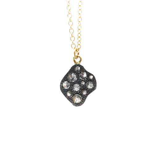 The Petite Diamonds Necklace is made with .20 carats of inverted white diamonds set inside a textured concave oxidized silver irregular disc. The cable chain is made of 18k yellow gold cable chain and is 16″ in length. Handmade and designed by Todd Pownell, this beautiful necklace is as commanding as it is delicate. Petite Diamonds Necklace N107.
