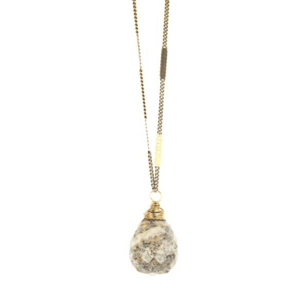 The Picture Jasper Drop Necklace is made with a natural Picture Jasper stone drop that is approximately 1″ long x 1/2″ wide. It has a 30″ Antique Gold Chain. This necklace is made with natural stones. The beauty of natural stones is that, no two gemstones are alike so irregularities of color and shape are to be expected. ZARA Picture Jasper Drop Necklace.