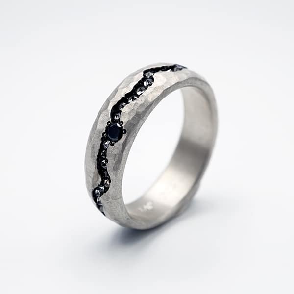 The Platinum Black on White Diamond is 7mm wide and made of solid hammered platinum. It has an inverted single cut white diamonds and five larger black diamonds totaling .65 carats set in the fissure. Platinum Black on White Diamond. R004PT.