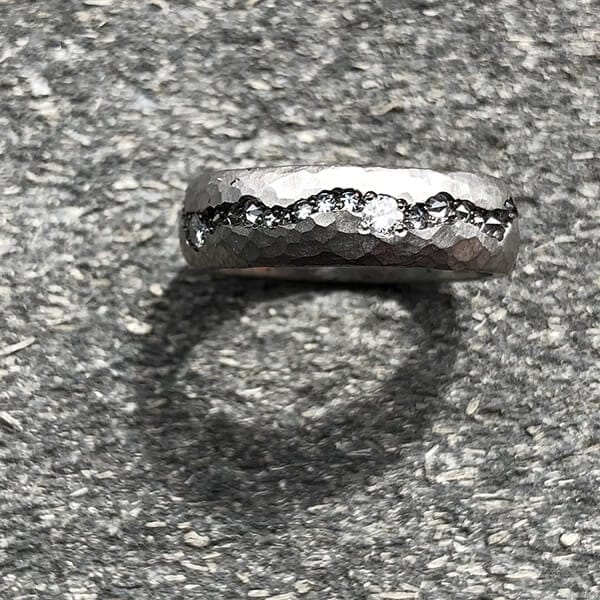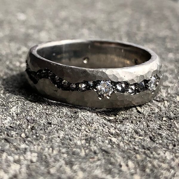 The Platinum Hammered Fissure Diamond Band is 7mm wide and made of solid hammered platinum. It has inverted single cut white diamonds and five white diamonds totaling approximately .60 carats set in the fissure. This particular wedding band is one of our most ordered rings. And since each ring is one of a kind, it’s designed to impress anyone who sees it. It can be made in any size and is also available in both in yellow gold and silver. R004pt.