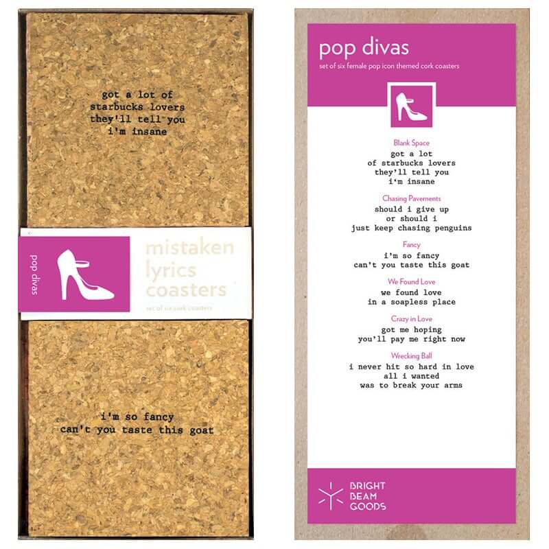 View Artistlyrics are laser engraved on 4″ cork squares