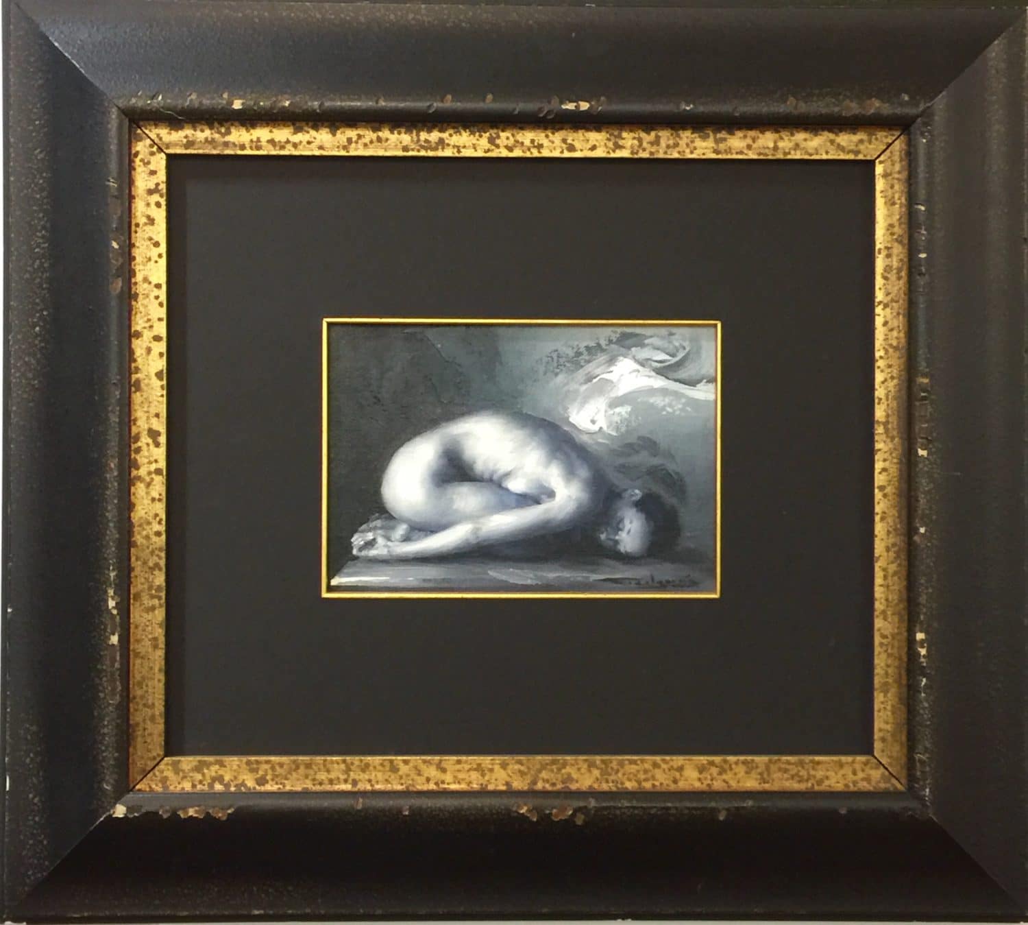 Original oil that is beautifully framed in a thick black molding with gold trim. Framed size: 22.5″ x 20.5.” Artwork size: 8.5″ x 6.5.”