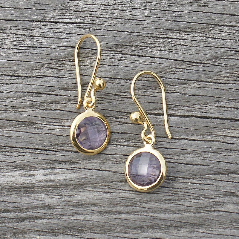The Sala Gold Vermeil & Amethyst Earrings are made of 22k gold vermeil and faceted amethyst earrings. Approximately 1″ long. E610A-AM