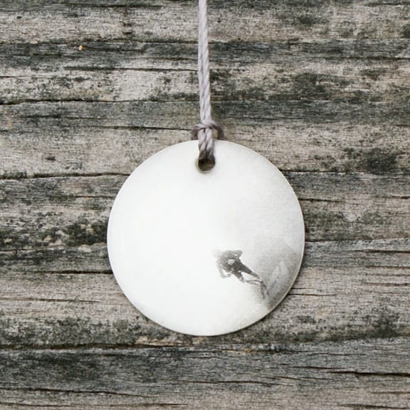 View ArtistThis Everyday Artifact necklace is titled Scuba. Miniature hand printed lithograph on a sterling silver 7/8″ disc. Finished with a durable epoxy coating. 18″ grey nylon cord with a sterling clasp.