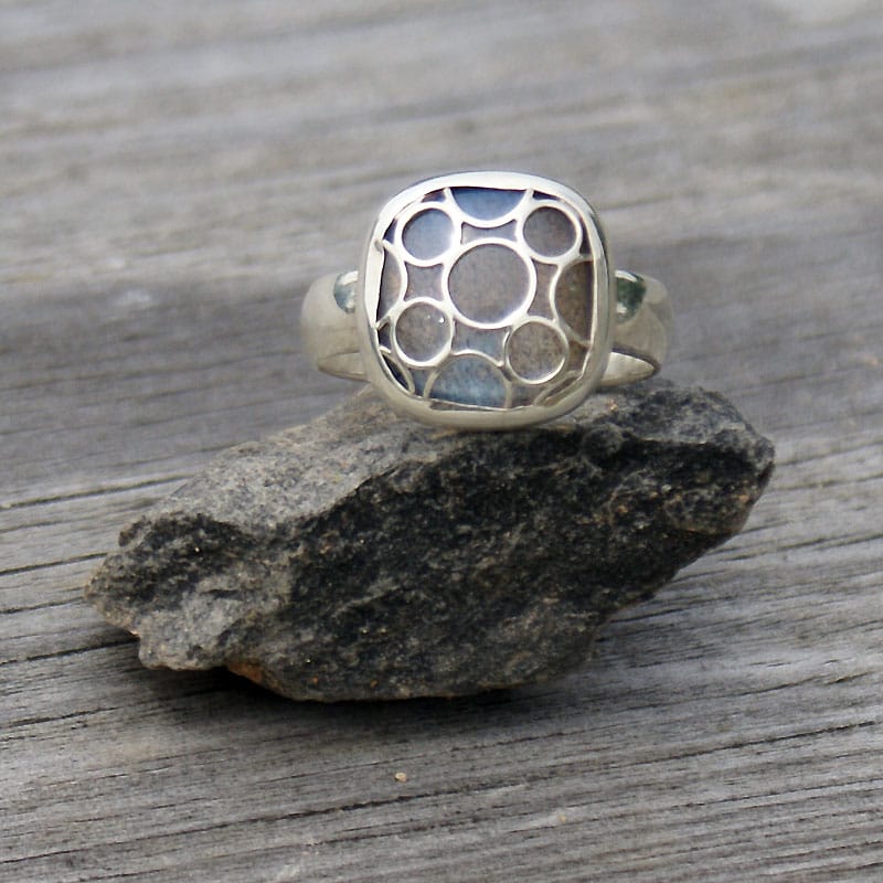 The Silver Square Labradorite Cage Ring is a sterling silver ring with rounded square labradorite. It is approximately 1/2″ wide. Size 8 in stock.