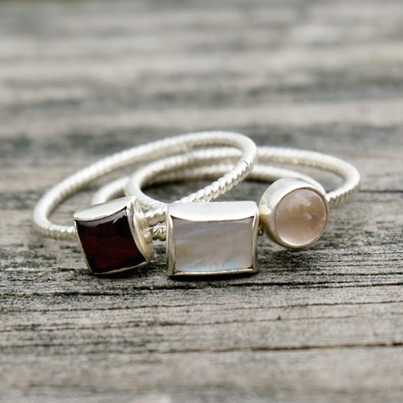View ArtistSet of 3 sterling silver stack rings. One each of garnet, pink quartz, and rainbow moonstone. Size 8. R603.