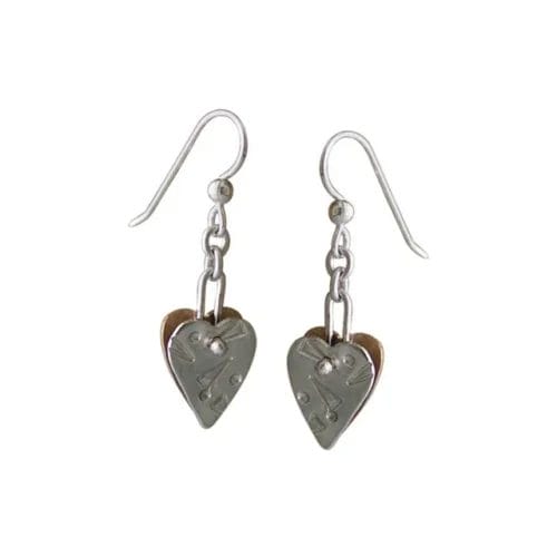 View ArtistThe Single Gypsy Heart Earrings are made with sterling silver and bronze. The earring are made from patterned sterling silver and bronze hearts that swing in unison on silver ear wires. They are approximately 1.45″ long x .45″ wide. These earrings are made by famed handmade jewelry designer, Thomas Mann.