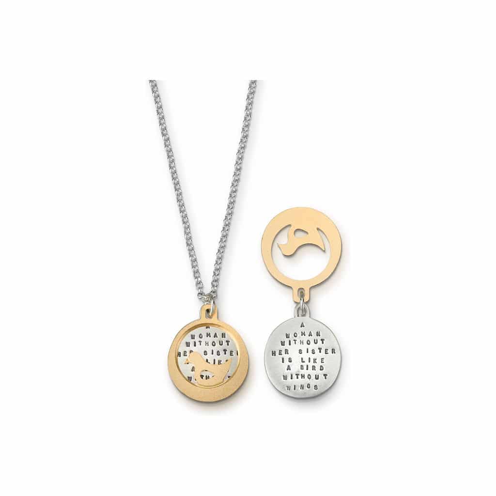 View ArtistThis Kathy Bransfield necklace is titled Sister Bird. It is made of brushed sterling silver, 18k gold plated bronze, 18″ rolo chain, 3/4″ pendant, TEXT: “” A woman without her sister is like a bird without wings “