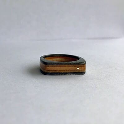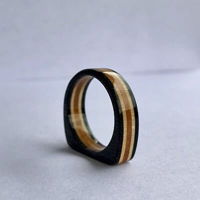These handmade Skateboard Flathead 1 is made from used and broken skateboards. As a skateboard, it contains 7 layers of Canadian maple, really hard wood. Every ring is 100% waterproof, so it never lost his shine, in direct contact with water and dirt too.
