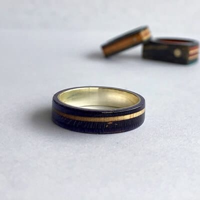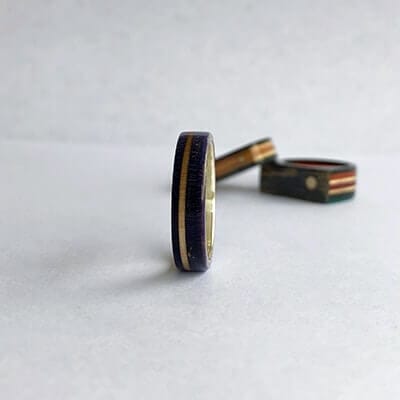 This is a handmade Skateboard Silver Ring 20 is made from used and broken skateboards. As a skateboard, it contains 7 colorful layers of Canadian maple, really hard wood. Each ring has a sterling silver liner. Every ring is 100% waterproof, so it never lost his shine, in direct contact with water and dirt too.
