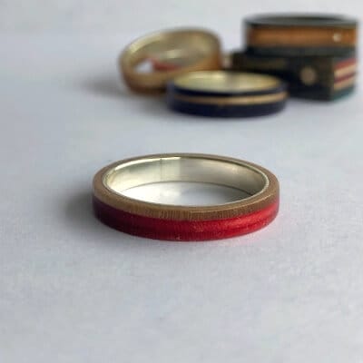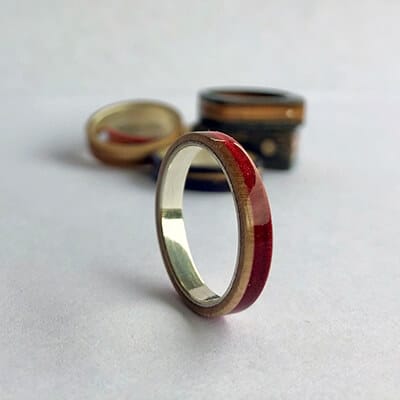 This is a handmade Skateboard Silver Ring 21 is made from used and broken skateboards. As a skateboard, it contains 7 colorful layers of Canadian maple, really hard wood. Each ring has a sterling silver liner. Every ring is 100% waterproof, so it never lost his shine, in direct contact with water and dirt too.