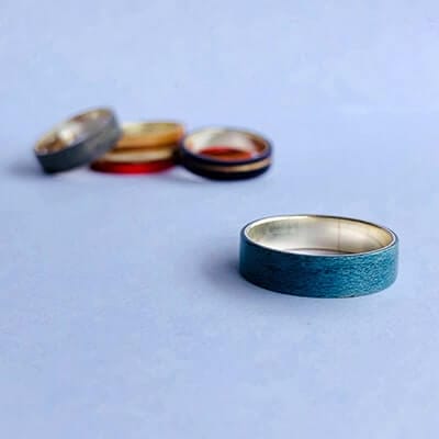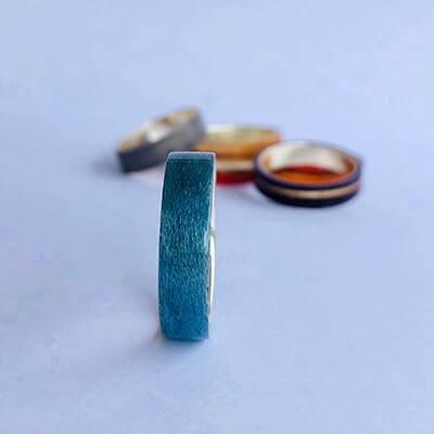 This is a handmade Skateboard Silver Ring 27 is made from used and broken skateboards. As a skateboard, it contains 7 colorful layers of Canadian maple, really hard wood. Each ring has a sterling silver liner. Every ring is 100% waterproof, so it never lost his shine, in direct contact with water and dirt too.