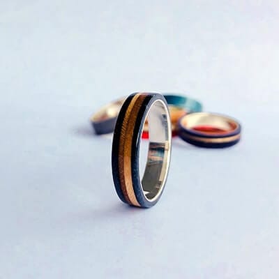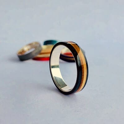 This is a handmade Skateboard Silver Ring 28 is made from used and broken skateboards. As a skateboard, it contains 7 colorful layers of Canadian maple, really hard wood. Each ring has a sterling silver liner. Every ring is 100% waterproof, so it never lost his shine, in direct contact with water and dirt too.