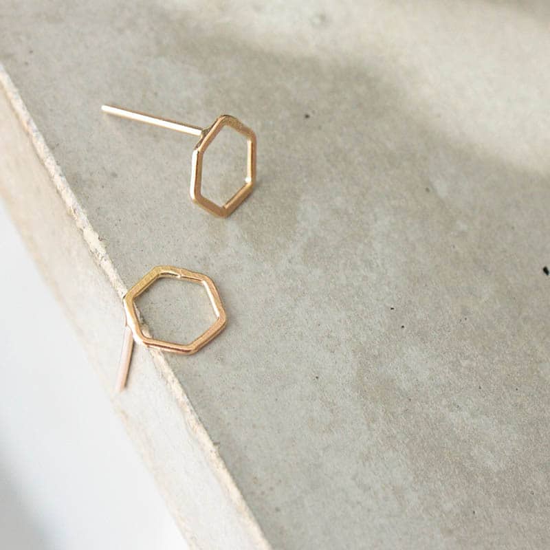 Small Hex Studs, approximately 1/4″ in diameter. Available in sterling silver, oxidized silver, or gold vermeil.
