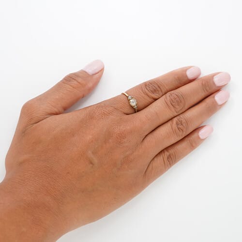 The Smoke Signals Three Stone Diamond Ring is stunning. It is an 18ky rough cut 1.5mm ring with a .62ct opaque diamond and .18 carats of trillion side stones. The way the light and dark colors play off of each other is absolutely wonderful. This 18k gold one of a kind rough cut diamond ring is handmade by Jennifer Dawes. Please keep in mind that this is a handmade ring, and stones are subject to availability. We will contact you with various stone options for your final approval of the purchase. Â