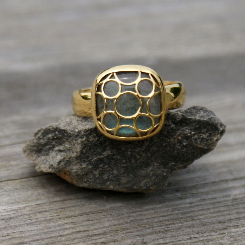 View ArtistThe Square Labradorite Cage Ring is a 22k yellow gold vermeil ring with rounded square labradorite, approximately 1/2″ wide. Size 9 in stock.