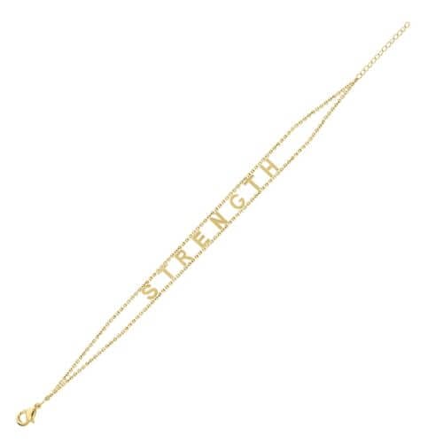 The Strength Empowered Bracelet is made of brass with 1/4″ x 1/4″ letters and plated in yellow or white gold. Each bracelet has an adjustable 6”- 8” extender. Its lobster claw closure makes it easy to put on and take off.