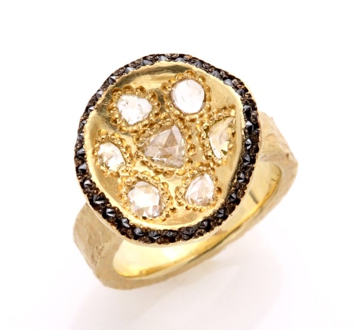 View ArtistLarge Rose-cut diamond crater ring. 4.5mm wide 18k yellow gold rustic hammered shank with a 17mm irregular crater at top set with seven irregular rose cut yellow diamonds inside and small inverted black diamonds set around the edge of the crater. TAP011