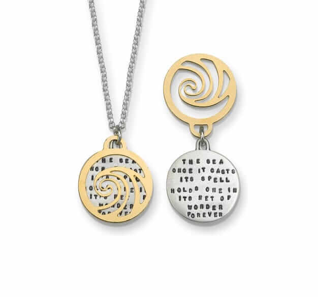 View ArtistThis Kathy Bransfield necklace is titled The Sea Casts. It is made of 22kt Gold plated brass and brushed Silver, 18″ Sterling Rolo, 3/4″ x 3/4″ pendant, TEXT: “The Sea once it casts its spell – holds one in its net of wonder forever” – Jacques Cousteau