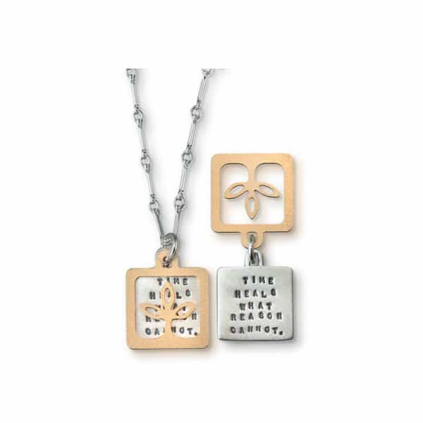 View ArtistThis Kathy Bransfield necklace is titled Time Heals. It is made of 18kt Gold plated bronze and brushed Silver, 16″ bar link chain, 1/2″ pendant, TEXT: “Time Heals What Reason Cannot.” – Seneca