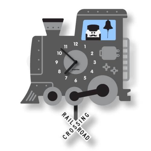 The Train Pendulum Clock is a pendulum clock with a 3D pop out effect. It was originally designed by the artist Paul Ocepek. It has a quartz pendulum movement, which is made in USA, and it is sized at approximately 11.5″W x 14”H x 1″D. The 1/8″ thick laser cut baltic birch plywood is printed with non-toxic water-based inks and it is pre-drilled hole for easy hanging. It is proudly made in Massachusetts, USA.