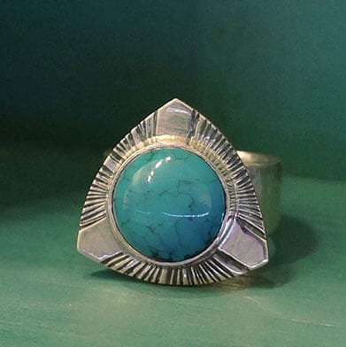 View ArtistThis Turquoise Ring is made of sterling silver and has a large turquoise center stone. The ring is approximately 3/4″ wide and sits on an 8mm band. Size 6 in stock.