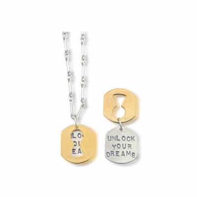 View ArtistThis Kathy Bransfield necklace is titled Unlock Your Dreams. It is made of 18kt Gold plated bronze and brushed Silver, 16″ bar link chain, 5/8″ x 1/2″ pendant, TEXT: “Unlock Your Dreams.”