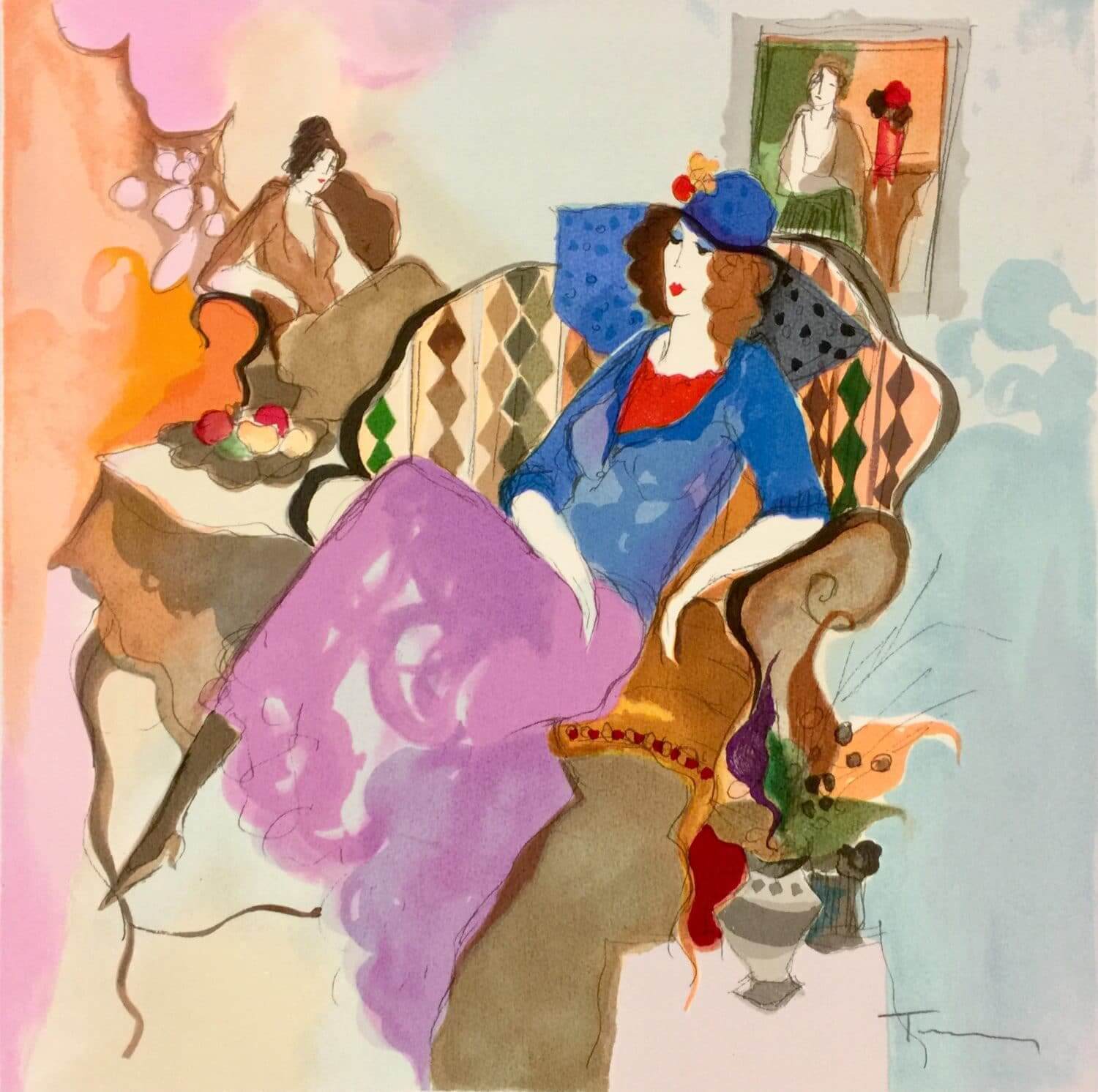 Itzchak Tarkay only produced 9 of these signed and numbered limited edition serigraphs. This one is number 8 of 9. It is wonderfully printed with subtle color tones giving it a beautiful watercolor treatment in appearance. Print is numbered on the back of the piece. Taraky prefers to keep nothing but his signature and the art itself on the front of a print.