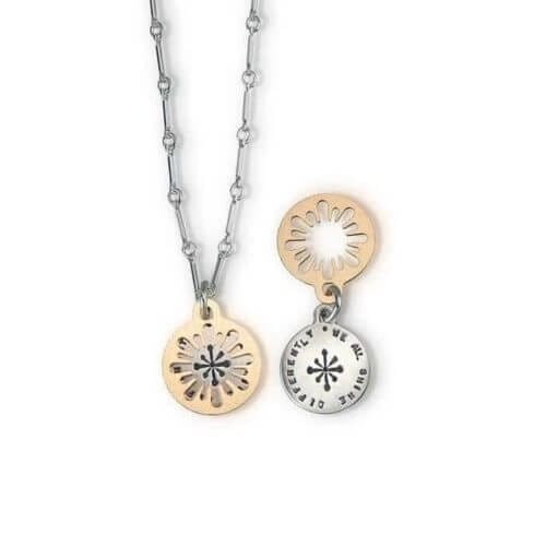 View ArtistThis Kathy Bransfield necklace is titled the We All Shine Necklace. It is made of 22kt Gold plated bronze and sterling silver, 18″ bar link chain, 5/8″ by 5/8″ inch pendant, TEXT: “We all shine differently ”.