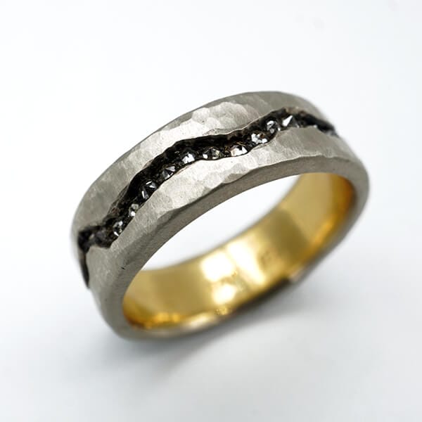 The White Gold Diamond Fissure is handmade by Todd Pownell. The hammered solid gold band is 7mm wide and made with 18k white gold over an 18k yellow gold liner. It has a darkened fissure set with approximately .5 carats of inverted white diamonds. White Gold Diamond Fissure R049. We have a size 9.5 in stock, but it can be resized in as little as 2 weeks.