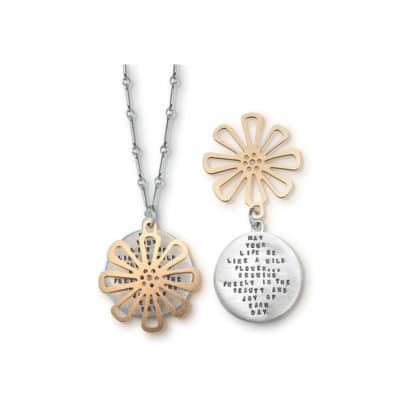 View ArtistThis Kathy Bransfield necklace is titled Wild Flower. It is made of 18kt gold plated bronze and brushed silver, 18″ bar link chain, 1″ pendant, TEXT: “May your life be like a wildflower…growing freely in the beauty and joy of each day” – Native American proverb. Wild Flower
