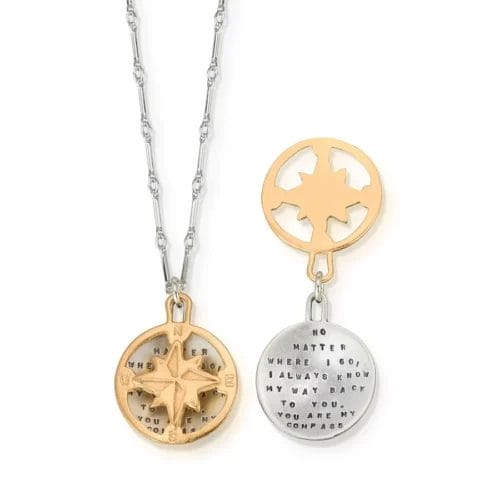 View ArtistThis Kathy Bransfield necklace is titled You Are My Compass. It is made of 22kt Gold plated brass and brushed Sterling Silver, 18″ Bar Link Chain, .75″ pendant, TEXT: “No matter where I go, I always know my way back to you. You are my compass”.